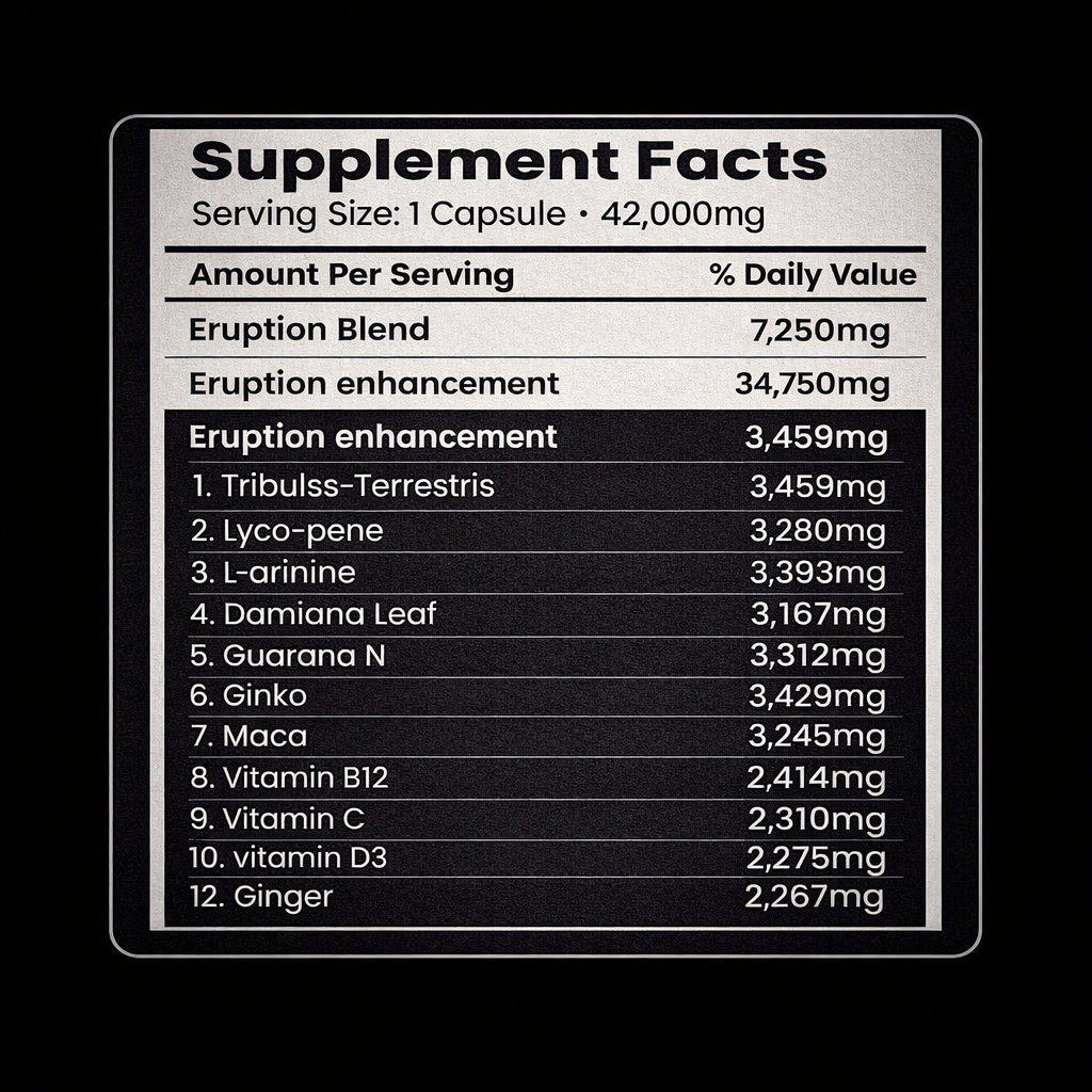 Eruption 42000 mg es un suplemento diseñado para potenciar el rendimiento masculino mediante una combinación de hierbas naturales y vitaminas. Ingredientes como maca, ginseng y tongkat ali apoyan la energía, la libido y el equilibrio hormonal. Su fórmula está orientada a mejorar la circulación y la resistencia para un mejor desempeño.
